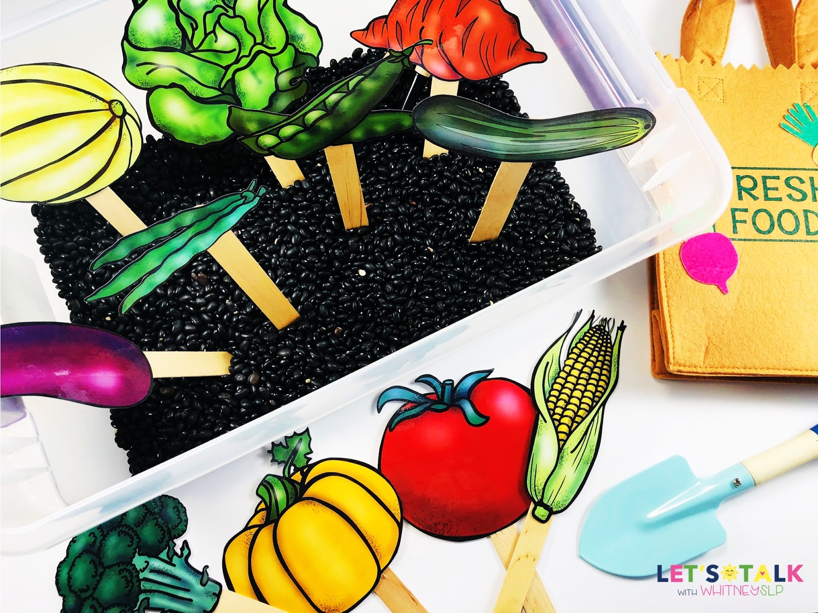 To make the sensory box, I bought a plastic container from Walmart and 2 bags of black beans for the dirt. I found the felt veggies in the Target Dollar Spot as well, along with the Fresh Food felt bag, but you can use plastic veggies too. The students have so much fun planting, watering, picking, washing, and eating the vegetables. It also works great for those students who love the sensory input of having their hands in the beans!