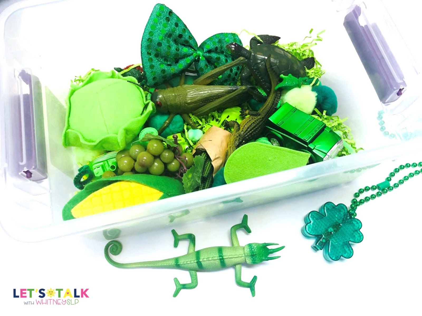Ok, I’ll admit. I’m pretty excited about this one. Several years ago, I introduced sensory boxes into my therapy sessions for pre-school and some of my younger self-contained classrooms. My older students would come to therapy and have a fit to use them too. While I don’t always use sensory boxes with the older kids, there is a lot to say for the excitement and engagement they bring. And usually when a student is that excited and engaged, a good bit of communication will follow. For Saint Patrick’s Day, I threw together this “green” sensory box in about 10 minutes with items I already had in my therapy room and at home. If you do buy green things, I’d check out Dollar Tree first!!