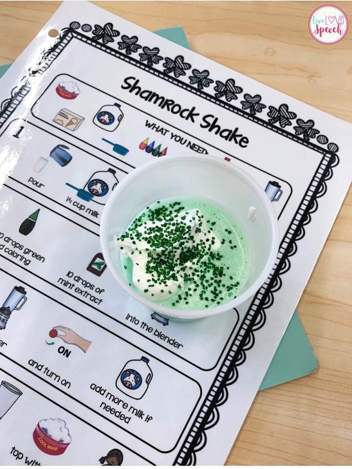 If you’ve never tried cooking in speech, you and your students are missing out! I realize that not everyone is allowed to have food at school, but if you are, I highly recommend it! I always make sure I have permission from the parents, but we’ve been cooking a lot this year thanks to Kristine from Live Love Speech’s Cooking and Craft Visual Recipe Book. It has been such a fun way to target skills like turn-taking, following directions, sequencing, comprehension, measuring, and much more. The students LOVE the cooking activities, and the Shamrock Shake lesson is no exception!