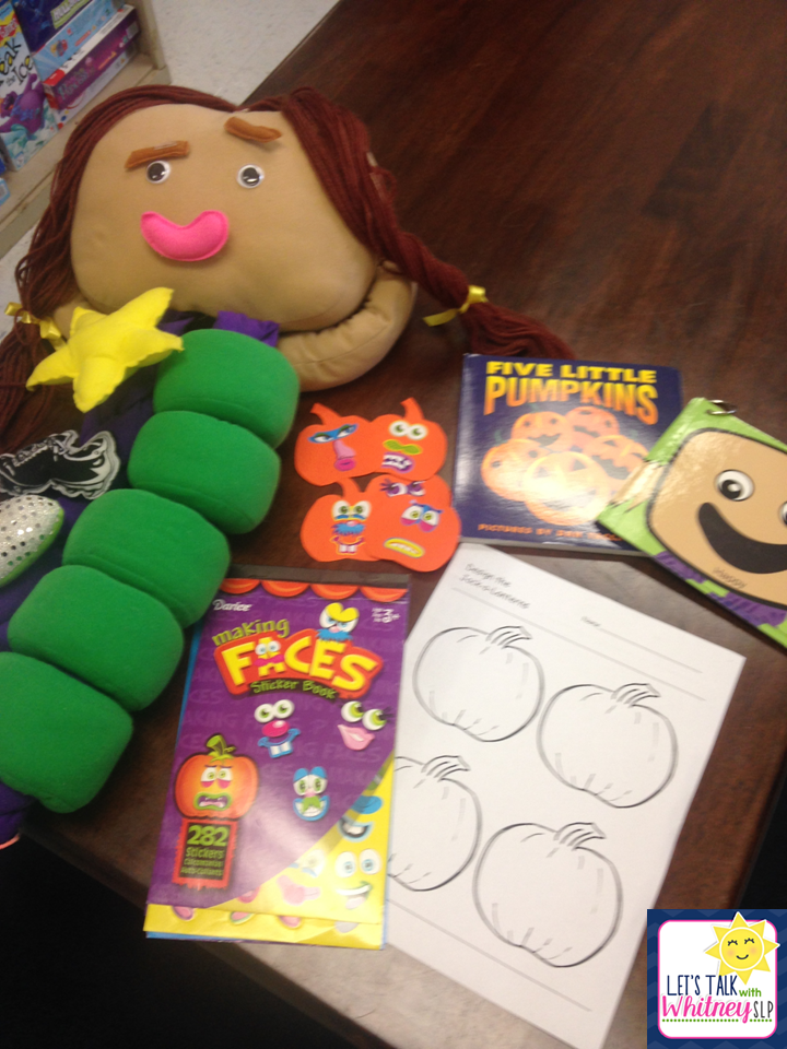 Mr. Potato Head is awesome for working on body parts, facial expressions, characters, and feelings. I found a Halloween character set a few years back, and we’ve used the Goblin and Ghost (as well as a pirate, Santa Claus, etc.) to discuss different characters and costumes!