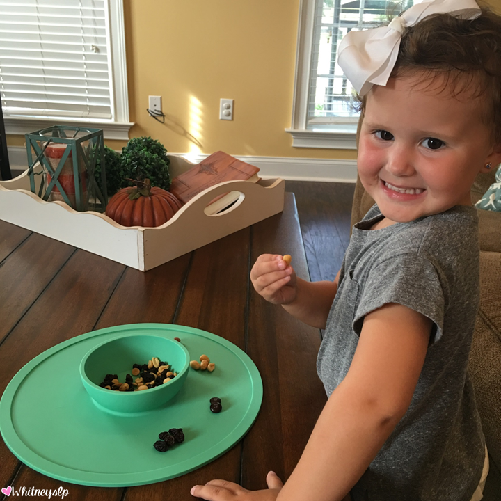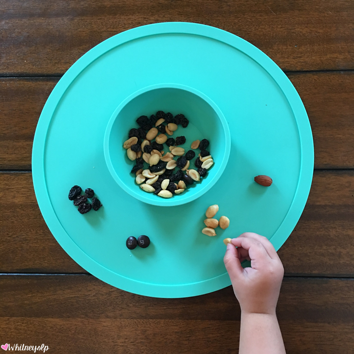 One other thing: I recently ordered the EZPZ Snack mat for Halle Jane thinking it would be a good alternative to having trail mix all over the floor in the living room for the dogs to scavenge. We absolutely love it! Because trail mix is a “go-to” snack in our house, I had Halle Jane sort out each type of food and practice counting the pieces while she was snacking. (Of course the M&Ms were gobbled up first, but she eventually got around to the raisins!)