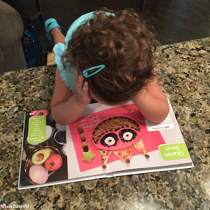 Best of all, the book inspired me to get my child in the kitchen with me. All too often I had been guilty of setting her up with an activity so I could cook dinner and just calling her when it was time to eat. Now, if there is a way for her to safely help, I let her. She takes ownership in helping me prepare dinner, and then she’s more likely to eat it all up! (She also LOVES helping me design the food art!!)