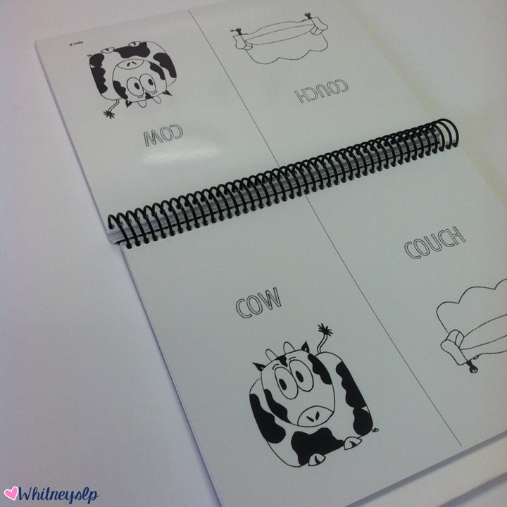 The pictures in the flip books are set up as minimal pairs. Minimal pairs are great for helping children become aware of what sounds they are saying, as well as how the sounds they choose affect how someone understands them. For instance, if a child is trying to say “couch” but leaves off the /ch/ on the end, you can visually show them how they said “cow” instead. Minimal pair therapy has been very effective for my kiddos with phonological processes.