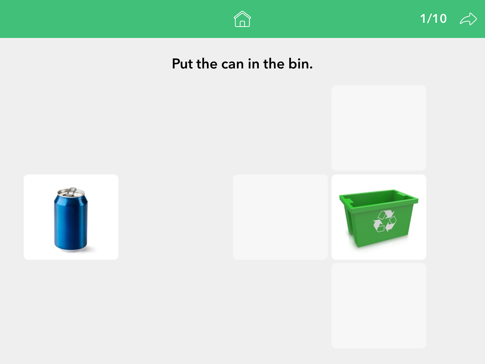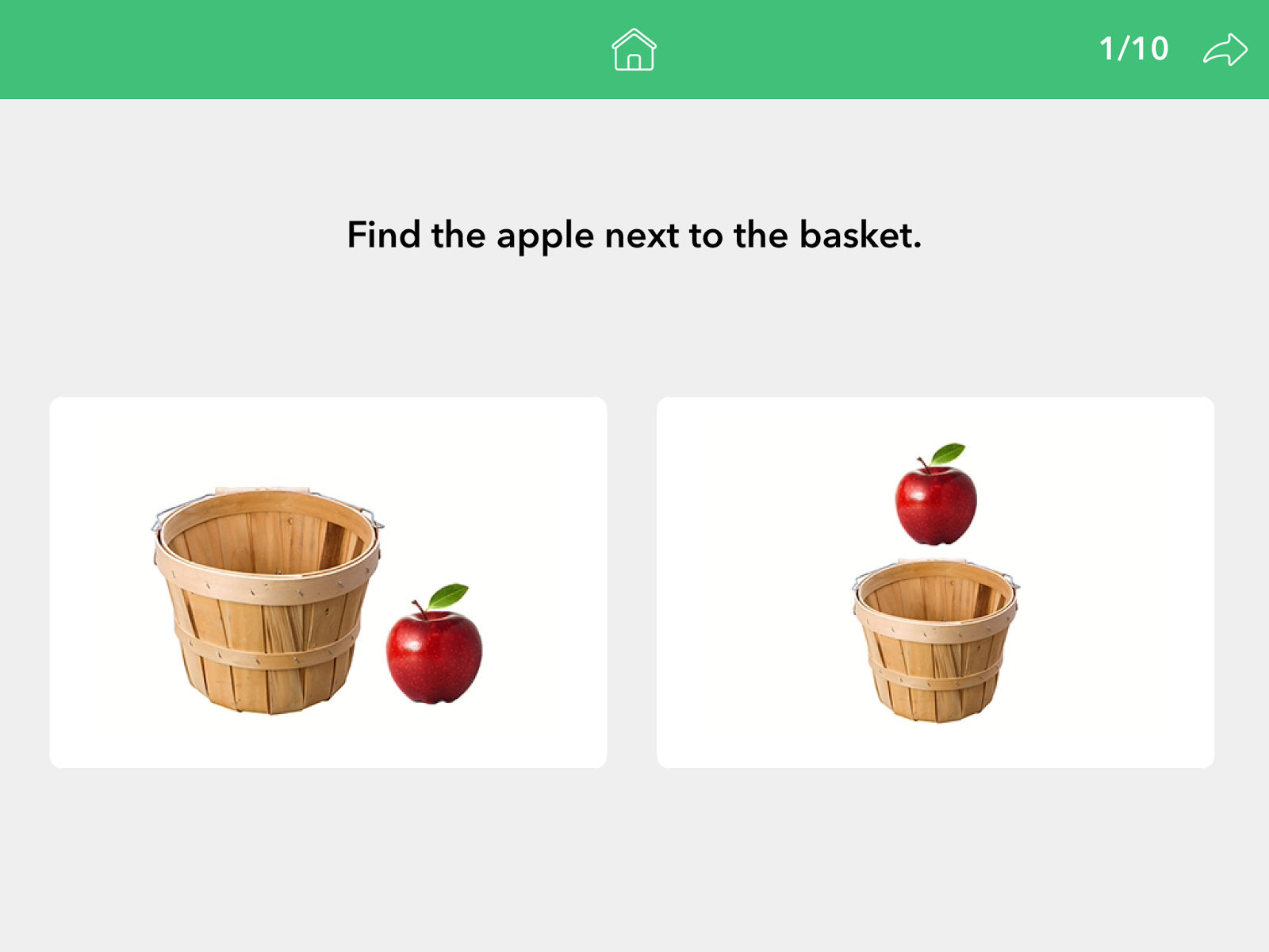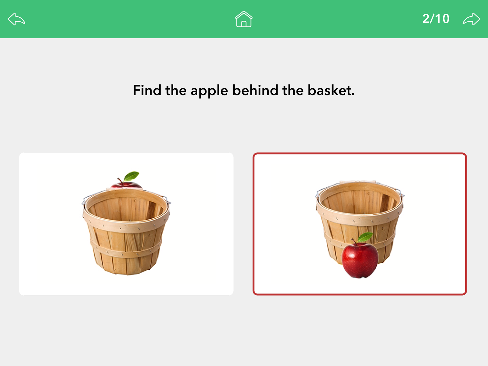 In the “Drag and Drop” section, the student simply drags and drops the object into the correct position. This is great practice for the students just learning prepositions…and how to follow 1-step directions embedded with spatial concepts!