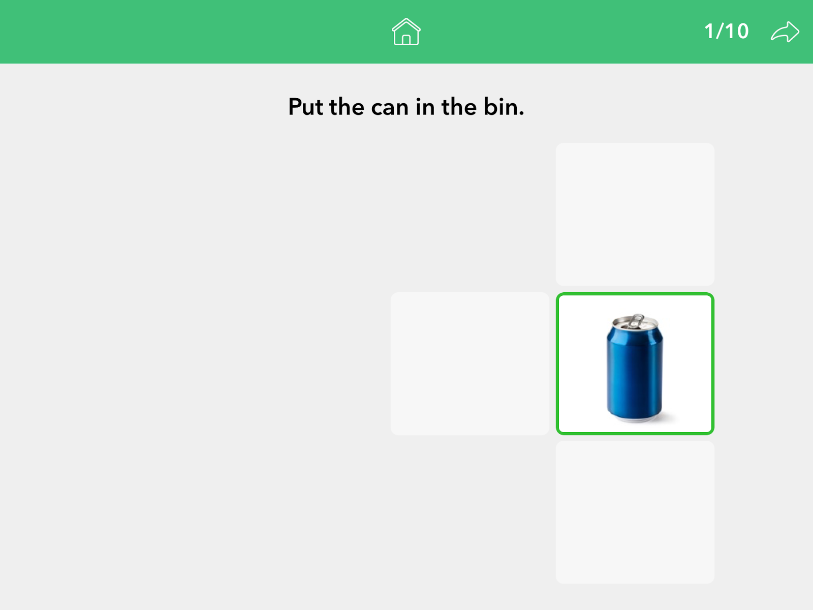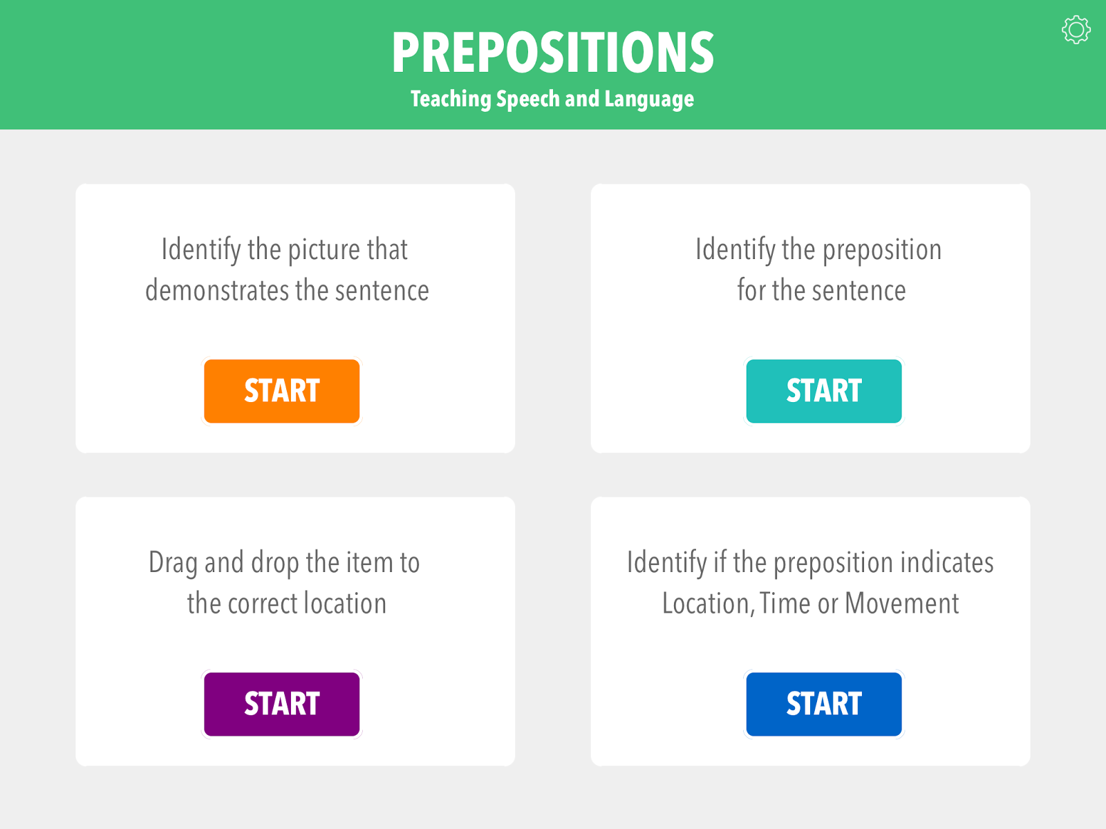 What I LOVE about this app is the simplicity. There are not tons of bells and whistles and other visuals/sounds that could be distracting to my little ones. When you open the app, you’ll see 4 boxes to choose from, seen in the picture above. I love how this provides 4 different ways to work on (and assess) prepositions, and some of them are more difficult than others for students with differing ability levels.