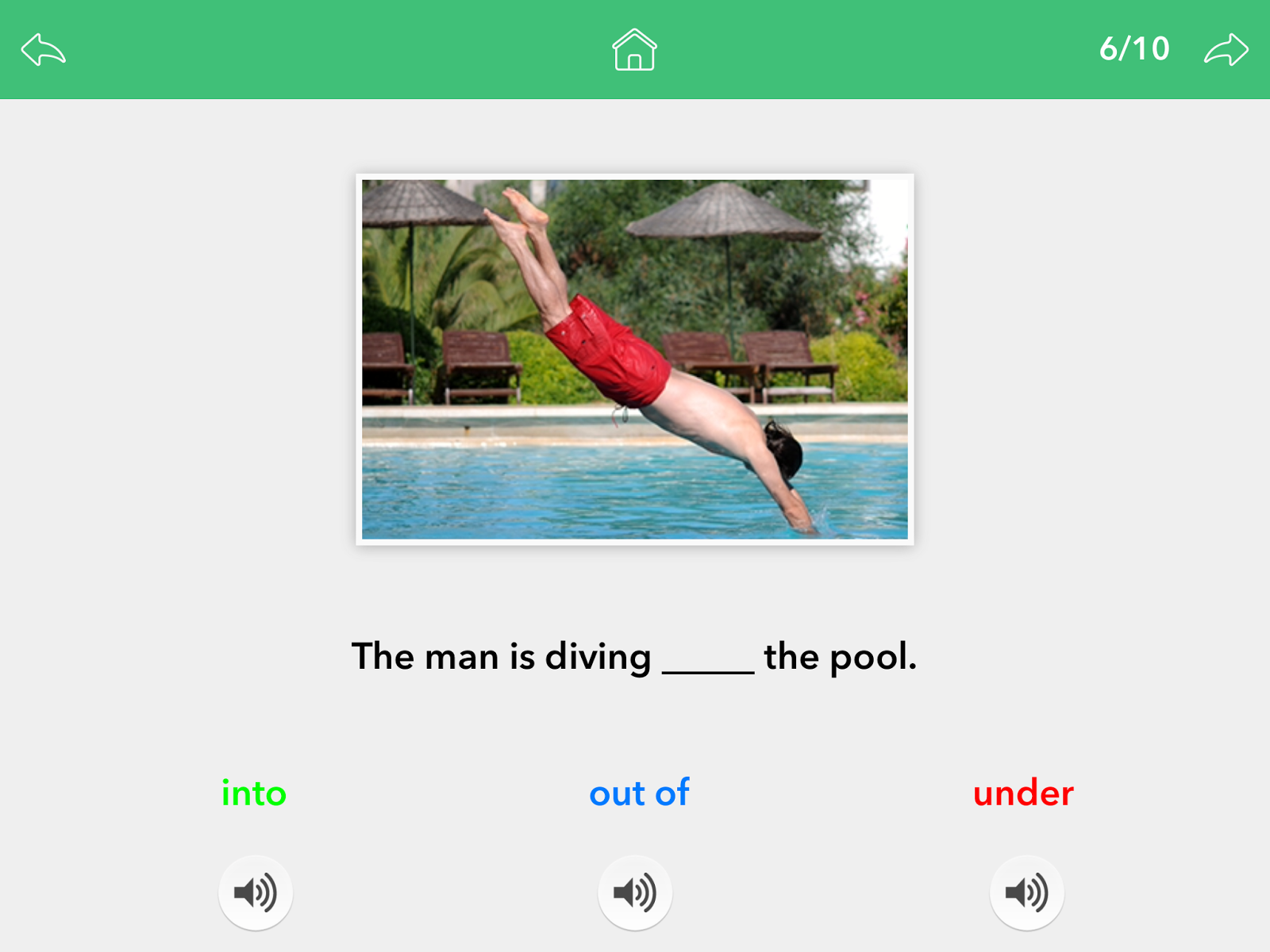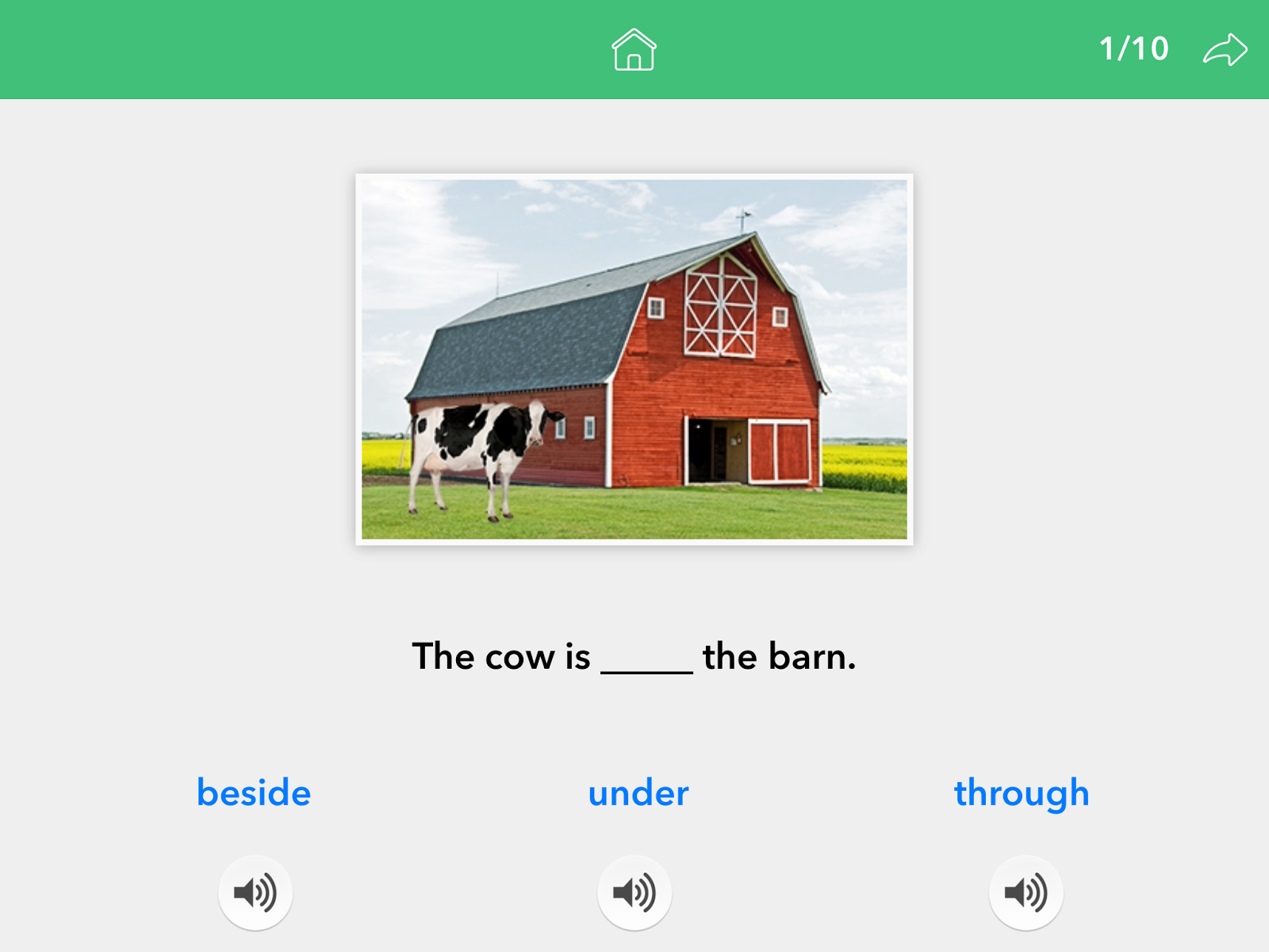 The picture below shows an example from Identifying the Preposition for the Sentence. By touching the microphone buttons under the answer choices, the students can have the answer choices read to them.