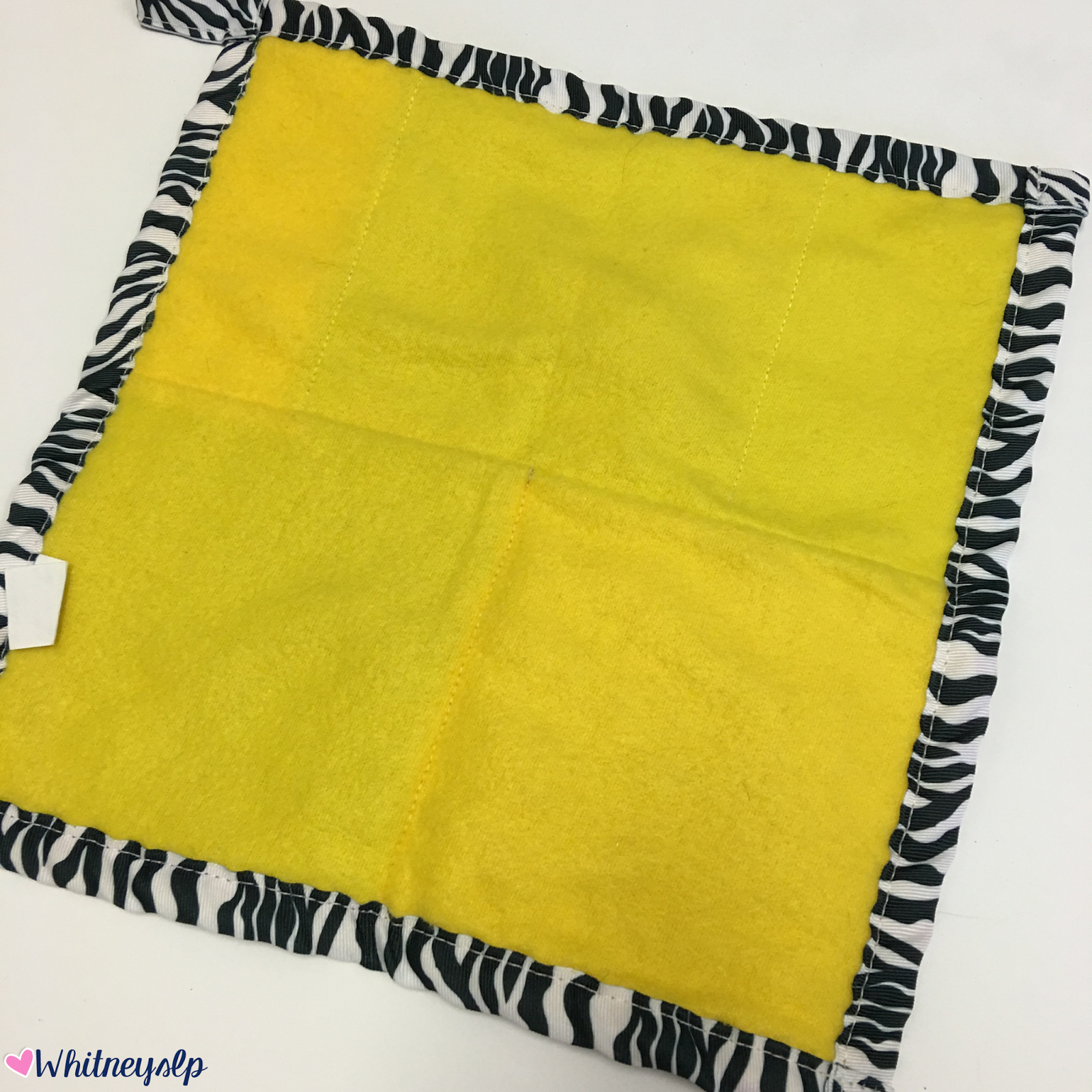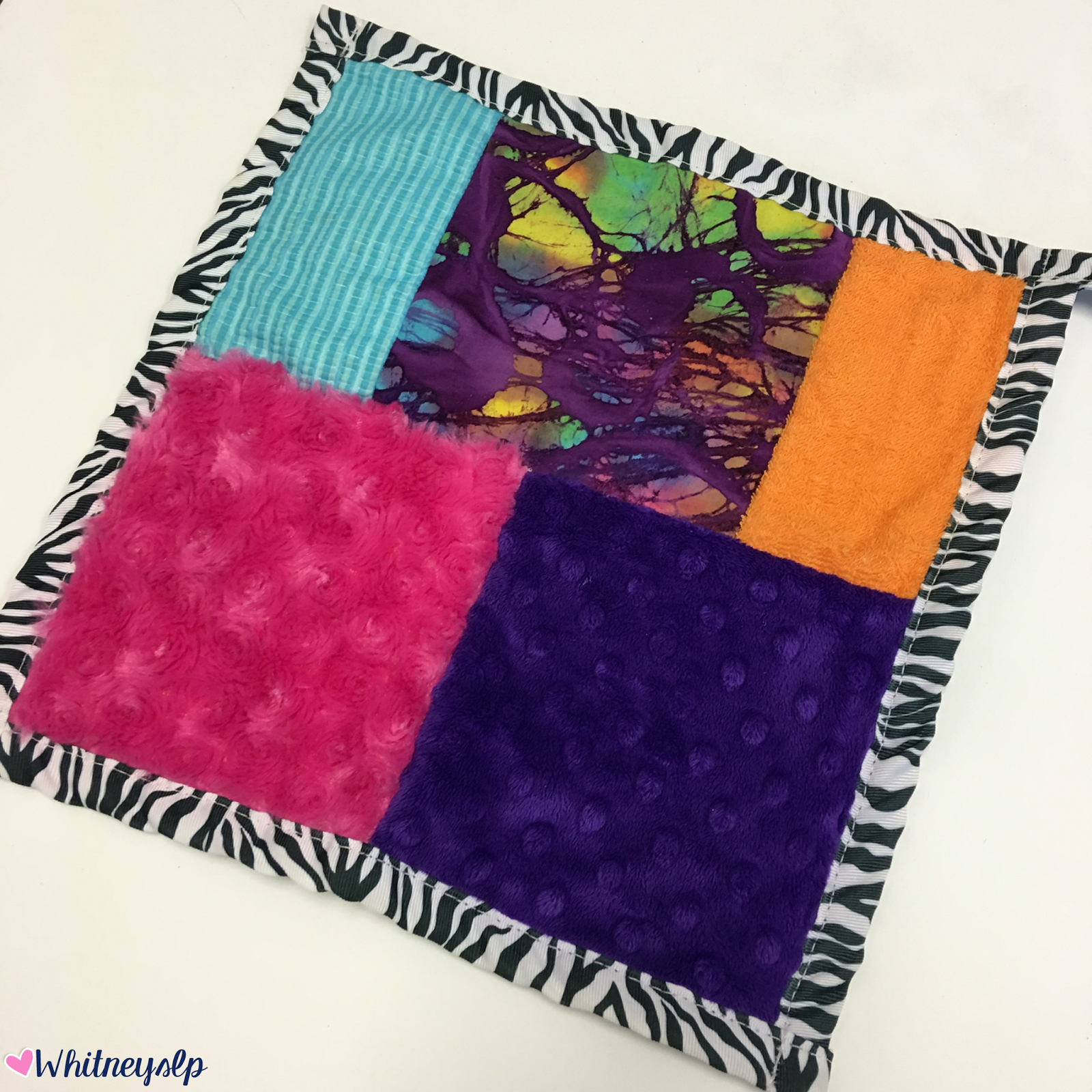 So let’s get started. The Fiddle Focus™ Busy Hands is a “quilt-like” square of five different fabrics combined together. The fabrics are different colors and have different textures. These are created to provide needed sensory experiences. The outside boarder includes a loop feature which is great for connecting other focus/sensory items or hanging the Fiddle Focus™ onto something (i.e. the stroller or car-seat). You can also add Velcro to the back to attach it to the desk, chair, etc. The Fiddle Focus™ Busy Hands and Busy Fingers™ (a smaller more “plush” version) come in different color patterns. They are handcrafted in the U.S., are recommended for all ages, and meet CPSC Safety Requirements.