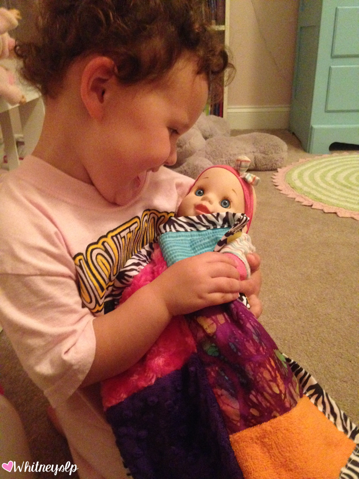 When I first gave the Fiddle Focus™ to Halle Jane, she determined it was a baby blanket. She used it to play with her baby dolls, but she also learned to rub it when she was extra excited/worked up and needed a sensory release. We have also taught her to squeeze it (or a stuffed animal) instead of squeezing a real person!