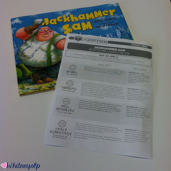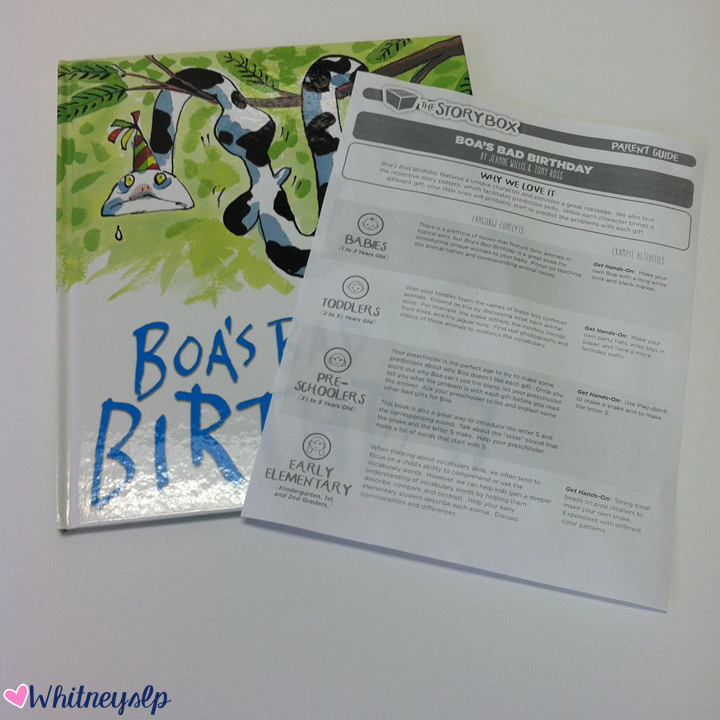 As an SLP and mommy, the best part of the box is the parent guides. There is a different parent guide for each book, and each parent guide explains why the book was chosen. It also lists language concepts and suggests supplemental activities for each book. These suggestions are broken down by age range (babies: 1-2 years, toddlers: 2-3.5 years, pre-schoolers: 3.5-5 years, and early elementary: K-2nd graders). These guides are AWESOME for quick lessons for SLPs and teachers, and even better for modeling how parents can interact with their children during reading!